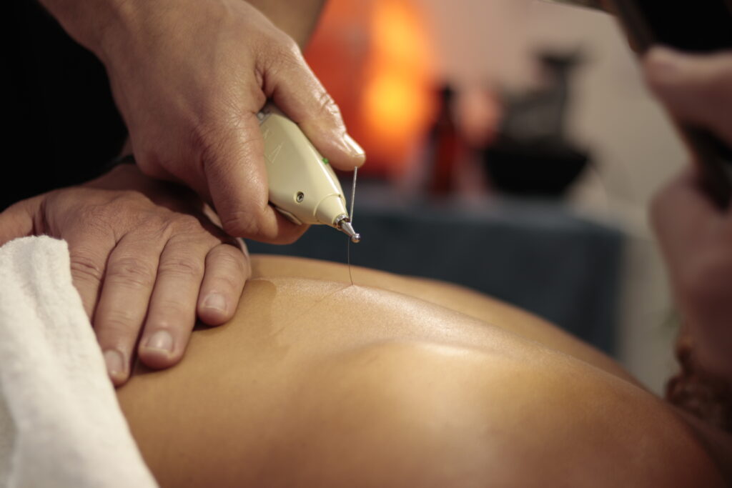 Alivio de la tensión muscular, mediante pequeñas descargas en una aguja de acupuntura que hacen que se deshaga cualquier nudo a nivel muscular y que el musculo recupere su tensión normal.